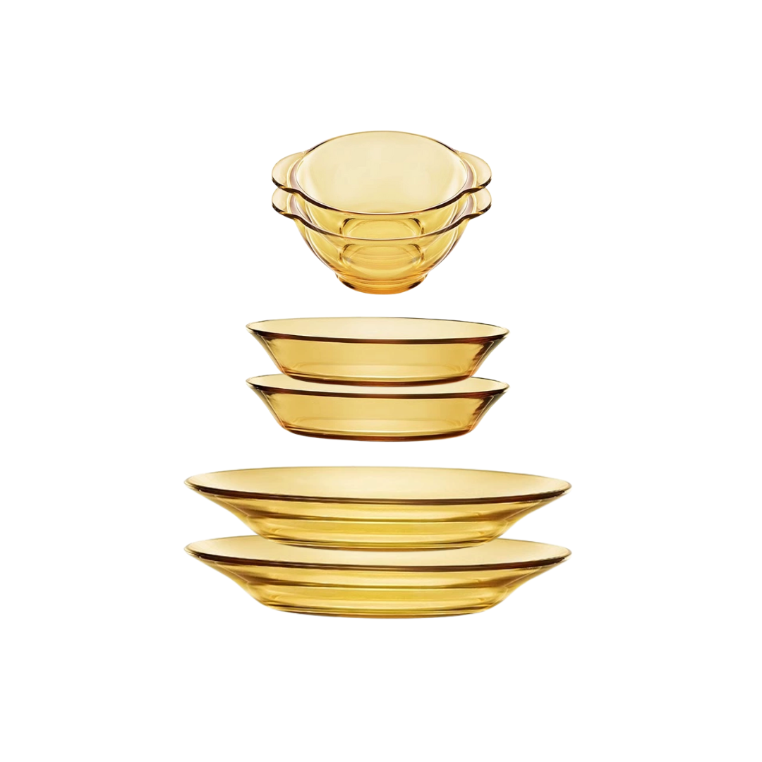 Elevate your dining experience with this 6-piece amber glass dinnerware set. Crafted from high-quality tempered glass, it offers durability, safety, and timeless elegance. Perfect for everyday meals or special occasions.