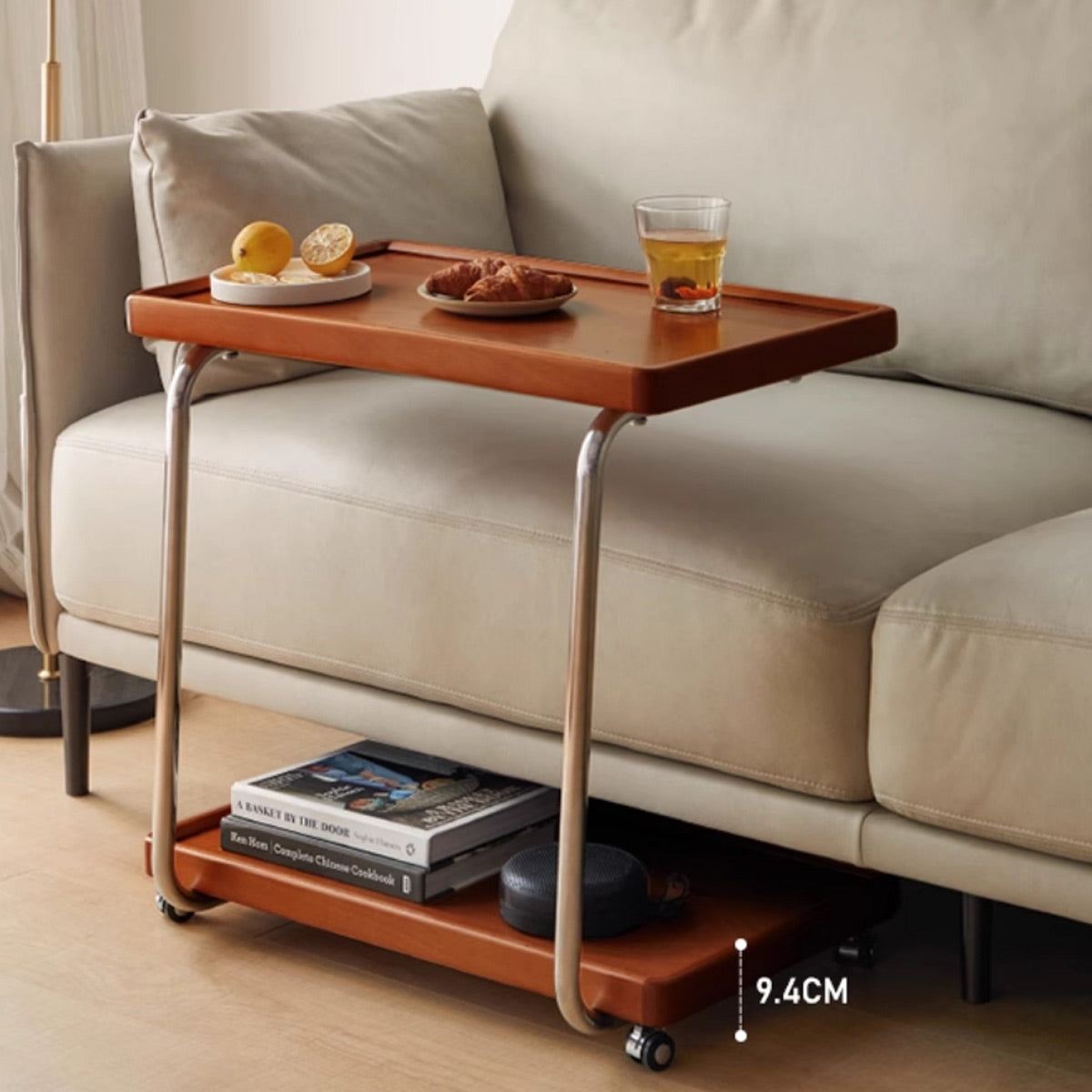 The Arlo Bar Cart is a stylish and functional addition to any space. It features a sleek design with two spacious wooden trays supported by a polished metal frame. Equipped with smooth-rolling wheels, this bar cart is perfect for serving drinks, snacks, or displaying your favorite beverages and glassware. The elegant brown finish complements any decor, making it an ideal choice for modern homes.
