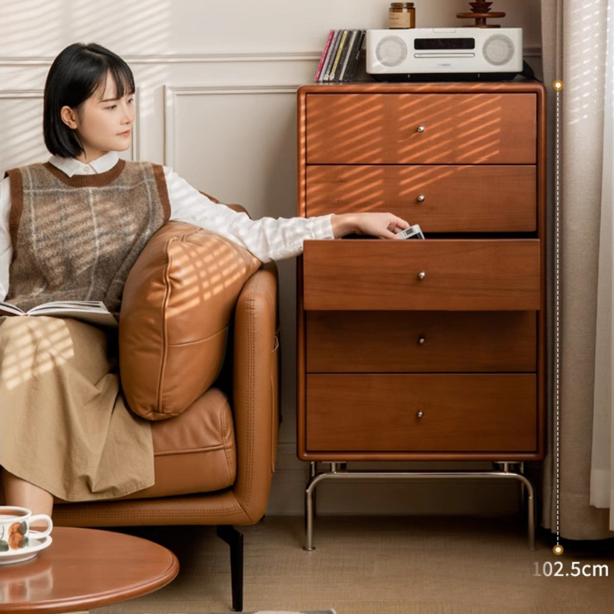 This Craig 5 drawer dresser exceeded my expectations! The vintage brown finish looks much richer in person than in photos, and the metal pulls give it a nice industrial touch. Assembly was straightforward – all pieces aligned perfectly. Each drawer glides smoothly and holds quite a bit of clothing. The metal feet add stability and prevent wobbling. For the price point, this dresser offers excellent value. It’s become the focal point of my bedroom. My only minor complaint is that the wood feels slightly thinner than expected, but overall build quality is solid. Highly recommend for anyone wanting vintage style without breaking the bank!