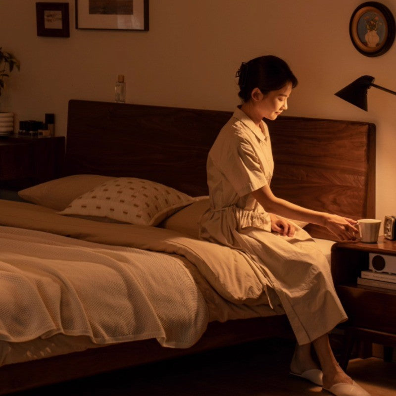 The Douglas Bed Frame combines strength and sophistication with premium North American walnut wood. Its thickened headboard and bedside design offer durability and elegance, enhanced by a natural plant-based wood wax oil finish that highlights the rich walnut grain. Key features include FAS-grade black walnut construction, a sturdy minimalist design, and long-lasting natural finish.