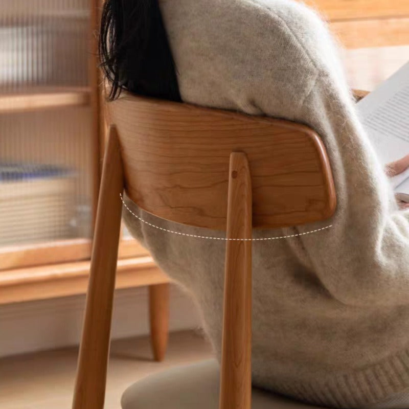 The Elise Dining Chair combines retro-inspired design with everyday comfort. Crafted from solid cherry wood, it features warm natural tones that add timeless character to any dining room. The gently curved backrest offers ergonomic support, while the cushioned seat is upholstered in soft neutral fabric for long-lasting comfort. Key features include a sturdy solid cherry wood frame, padded seat with soft-touch upholstery, retro minimalist design with clean lines, and versatile placement suitable for dining rooms, studies, or as an accent chair.