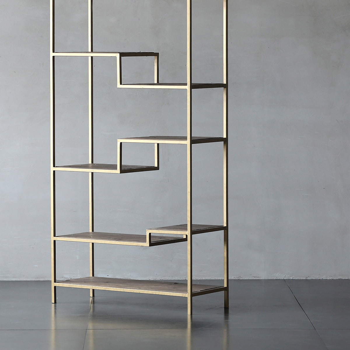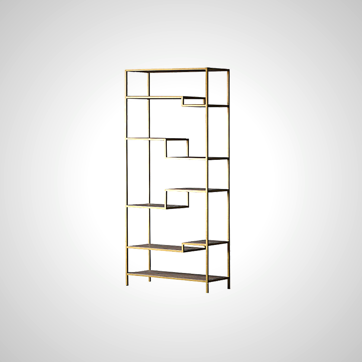 Elevate your space with the Estelle Bookcase, featuring a sleek stainless steel frame in a chrome finish. Its open geometric design with asymmetrical elements makes it perfect as a bookcase, living room accent, or room divider.